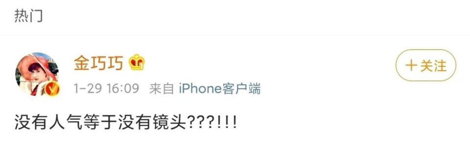 为此她也忍不住发文质疑:没有人气等于没有镜头?